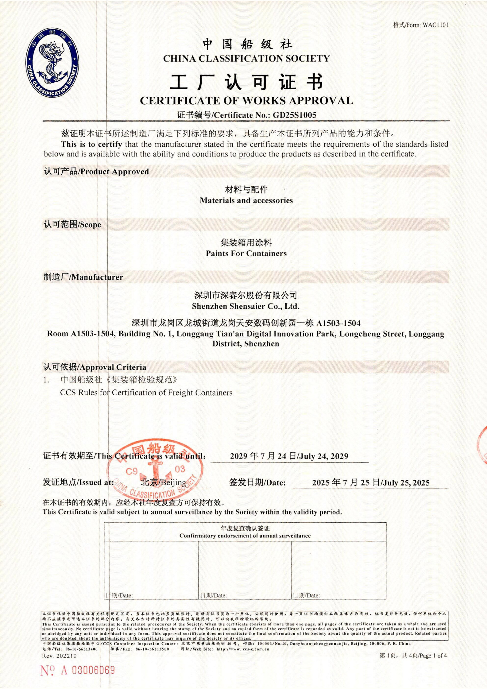 CCS中國(guó)船級(jí)社證書